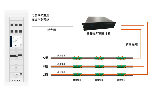 通过敷设在高压电缆上的感温光纤来实时测量电缆的温度,并通过智能光纤测温主机进行温度数据采集,实现对高压电缆表层温度的真实有效监测、无盲区监测,可进行在线连续测温,当监测到温度异常时,能够迅速定位并发出报警信号,提醒监控中心采取有效手段,用以确保高压电缆线路的安全运行。